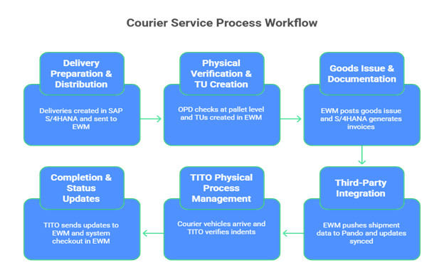 For a leading courier service provider, Stellium designed a TITO-enabled workflow connecting SAP S/4HANA, SAP EWM, Stellium’s TITO framework, and third-party logistics platforms. The process included: